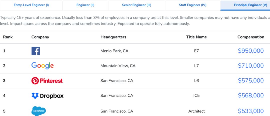 Facebook、谷歌等巨头的首席工程师,应该是公认的厉害人物吧!根据 Levels.fyi的统计数据,对于首席工程师,Facebook支付的年薪是约95万美元,而谷歌的报价估计高达71万美元。