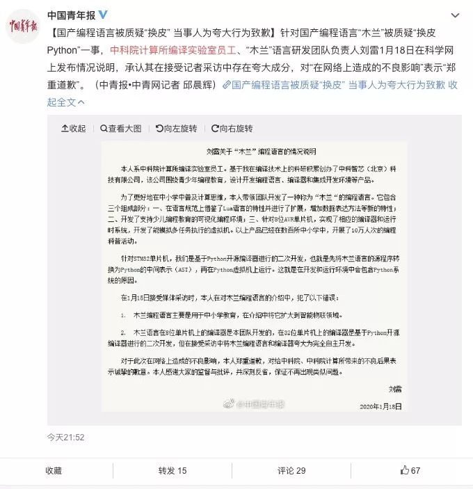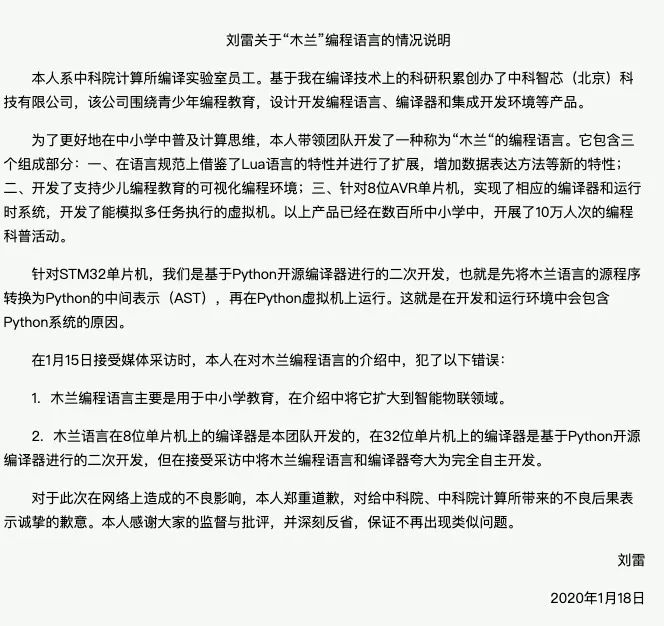 近期,中国科学院计算技术研究所计算机体系结构国家重点实验室宣布,由该实验室编译组主导研发的国产编程语言“木兰”正式发布。据中科院计算所介绍,“木兰”是一款定位于面向智能物联应用、采用最新编程语言设计理念和编译技术的程序设计语言,开发团队致力于将其打造为“智能物联时代的C语言”。但是,木兰编程语言发布后不久,就被网友质疑是Python语言换壳的产品,使用时网友发现了和Python一样的图标、对话框,提供的函数也和Python一样。在知乎上,很多开发者发现解包后的木兰语言其实就是建立在Python之上,将Python构建的环境、包和项目都编译成一个可执行文件。一时间,关于木兰编程语言换壳Python的议论集中爆发。18日下午,“木兰”语言研发团队负责人刘雷针对网友们的质疑做出了正面回应,表示为自己夸大宣传的行为致歉。刘雷表示,“木兰”编程语言是围绕青少年编程教育,设计开发编程语言、编译器和集成开发环境等产品,而在采访中,自己犯了以下错误:1. 木兰编程语言主要是用于中小学教育,在介绍中将它扩大到智能物联领域。2. 木兰语言在8位单片机上的编译器是本团队开发的,在32位单片机上的编译器是基于Python开源编译器进行的二次开发,但在接受采访中将木兰编程语言和编译器夸大为完全自主开发。刘雷表示,为此次“木兰”编程语言在网络上造成的不良影响,表示郑重道歉,对给中科院、中科院计算所带来的不良后果表示诚挚的歉意。再看“木兰”,可以发现这和当年的汉芯事件何其相似,满天芯带大家简单回顾一下。