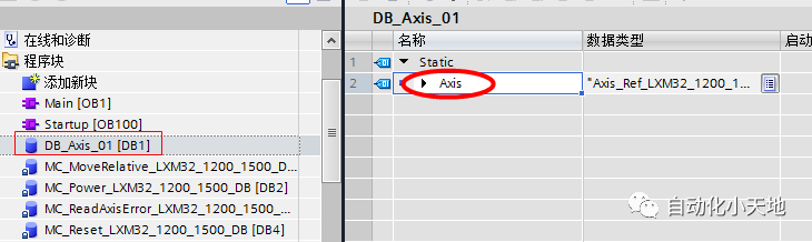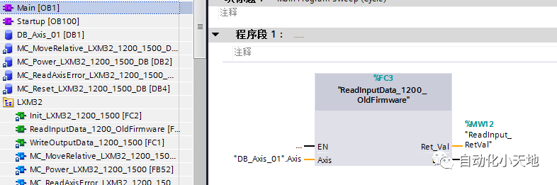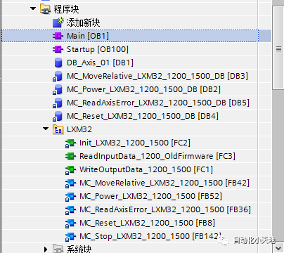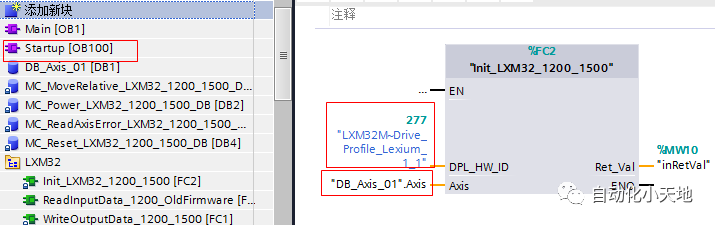 8.添加Startup[OB100]块,调用“Init_LXM32_1200_1500”;