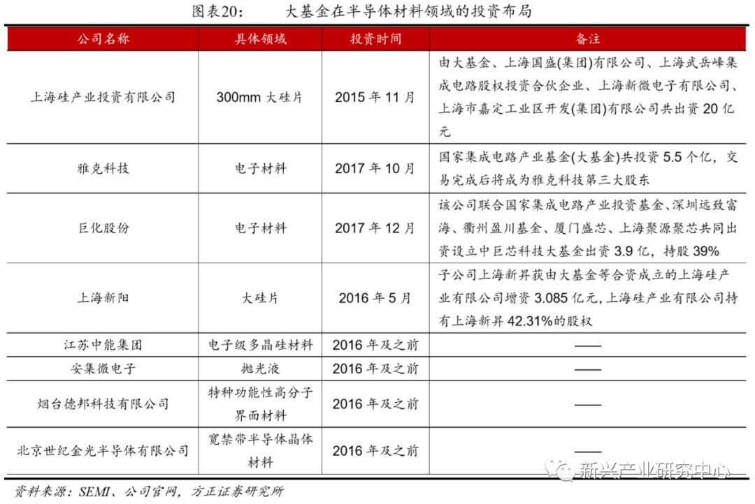 从大基金(一期)的投资情况来看,大基金在制造、设计、封测、装备材料等产业链各环节已经实现了投资布局全覆盖,各环节承诺投资占比分别为63%、20%、10%、以及7%,其中,半导体材料预计约占比3%~4%。目前大基金在半导体材料环节的投资标数量约10家,主要集中包括上海新阳、安集微电子等细分行业的龙头公司,同时也正在积极推动包括雅克科技、巨化科技等企业的产业资源整合,有望将其分别打造成为国内半导体材料在电子气体及湿电子化学品等细分行业的龙头企业。
