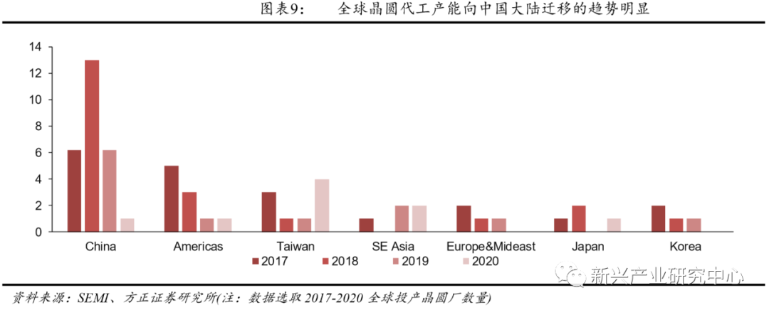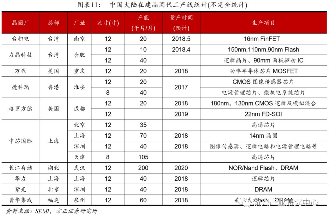 本土晶圆代工产能放量在即,半导体制造产业转移趋势明确。一方面包括台积电、联电、GlobalFoundries等在内的多家海外晶圆代工企业将在大陆投放产线,另一方面国内晶圆代工厂包括中芯国际、华力微电子等在未来2年内也将有多条产线投产。根据SEMI统计,预计在2017-2020之间全球将有62座晶圆厂投产,其中26座晶圆厂来自中国大陆,仅2018年大陆就会有13座晶圆厂建成投产(如图表9)。从政策层面看,国家在“中国制造2025”中明确制定目标至2020年集成电路自给率将达到40%、2025年达到50%。国家集成电路产业投资基金(大基金)的设立承载了国家意志,在资金与政策双重推动下,本土半导体产业将迎来快速发展。截至2017年11月30日,大基金累计有效决策62个项目,涉及46家企业,累计有效承诺额1063亿元,实际出资794亿元。在此带动下,湖北、四川、陕西、深圳、安徽、江苏、福建、以及辽宁等地方政府纷纷提出或已成立子基金,合计总规模超过3000亿元。大基金的设立满足战略性产业对长期投资的要求,又利用基金机制有效避免了国家直接拨款或直接投资等传统支持方式带来的弊端。海外晶圆代工企业纷纷宣布在大陆地区的扩增或新建晶圆厂计划,包括台积电、GlobalFoundries、联电、力晶科,以及TowerJazz等新厂大部分将于2017年底或2018年加入生产营运。其中,联电与大陆IC业者福建晋华合作,在福建兴建12寸晶圆厂,并且会采用联电开发的32nm制程来生产DRAM存储器;GlobalFoundries与大陆成都政府合作兴建12寸晶圆厂,将采用主流130nm和180nm技术制造IC。台积电则是投资30亿美元在南京设立晶圆代工厂,该厂将于2018年下半年开始以16nm制程,提供晶圆代工服务。