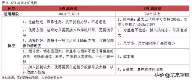 SAW体积小,制作成本低,但使用范围受限。与传统腔体/陶瓷滤波器相比,SAW体积更小,可以制作在晶圆上进行低成本批量生产,在低频段有很好的使用价值。但是,SAW 在中高频表现一般,当频率高于1GHz时选择性降低,在2.5GHz左右时仅限于中等性能的 应用。此外,SAW对温度变化较为敏感,温度上升时,声表面波速度降低,基片材料刚度降低,滤波器性能下降。由于温度性能不佳,加上频率选择具有较高局限性,SAW在 5G时代将面临挑战。对于声表面波器件来说,对温度非常敏感。在较高温度下,SAW滤波器的性能会下降。一种替代方法是使用温度补偿(TC-SAW)滤波器,它是在IDT的结构上另涂覆一层在温度升高时刚度会加强的涂层。温度未补偿SAW器件的频率温度系数(TCF)通常约为-45ppm/℃,而TC-SAW滤波器则降至-15到-25ppm/℃。目前TC-SAW技术越来越成熟,国外大厂基本都有推出相应产品,在手机射频前端取得不少应用,而国内的工艺仍需要摸索。普通SAW支持的频率在2GHz以下,村田开发出I.H.P.SAW滤波器(Incredible High Performance-SAW)。村田希望SAW滤波器使用频率能达到4GHz以下,目前量产的频率可达3.5GHz。I.H.P.SAW可以实现与BAW相同或高于BAW的特性,具备高Q值、低TCF、高散热性的优点。BAW滤波器在高频段领域具有明显优势,但生产工艺复杂,生产成本较高。与SAW相比, BAW在频率实用性和温度特性等方面优势明显,能更好地实现高频段的筛选,最大可以 工作到20GHz,功率接近40dBm(10W),且对温度变化不敏感,具备“插入损耗小,带 外衰减大”等优点。但是,BAW制造流程相比SAW更为复杂,工艺步骤约为SAW的近10倍, 生产制造成本远高于SAW。出于成本因素考量,目前大多数智能手机仍采用SAW方案,未 来随着5G手机不断渗透,BAW滤波器凭借在高频段领域的优良特性,市场份额有望提升。