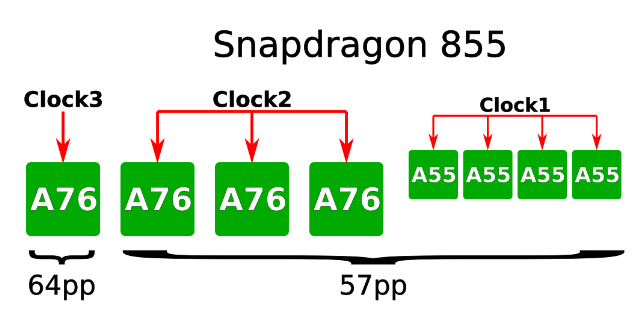 Chi reported that at the same power, Clock2 CPUs have improved by roughly 20% from the SDM845 to the SDM855. With the addition of Clock3, the four cores collectively extend this performance gain over the quad-core cluster on the 845 to over 30%.