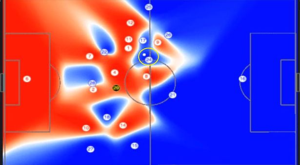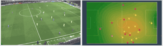 球场每个位置的实时进球价值都用颜色演示了,红色代表很有价值,绿色代表没有价值——