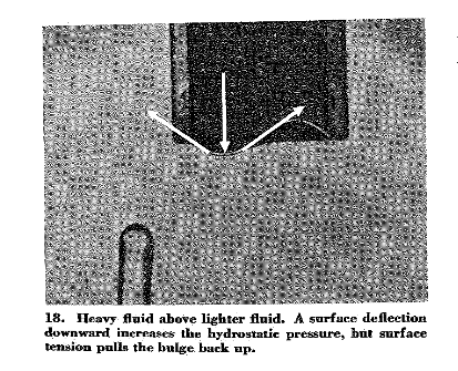 对于倒置的玻璃杯,上方较重的液体是水,下方是较轻的空气。上面说的情况对应于一定量的空气进入水中,相应的此时将有等量的水滴落下来。如果这个过程一直持续下去,水将倾泻而出,相应数量的空气将向上占满原来水的空间,从而形成复杂的运动。