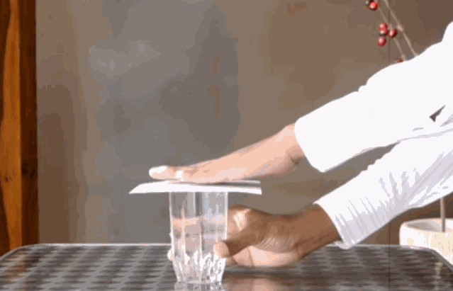 不过物理课上经常用下面的实验来演示大气压,拿起一个玻璃杯,装满水,放一张可以将开口完全覆盖的纸,然后将玻璃杯和纸张倒过来,由于大气压的存在,所以水并不会掉出来。