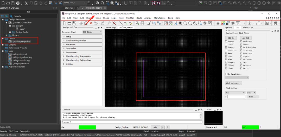 PCB文件编辑器会将新建的outline_temptr.brd文件自动打开显示。