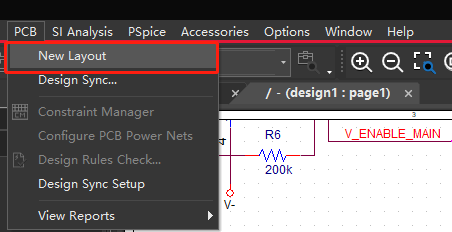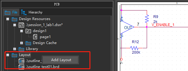 可以在菜单选择PCB—New Layout命令,该命令就是用来新建PCB文件(新建的PCB Layout文件默认是.brd格式的文件和当前的原理图配套)。同样的操作可以再次新建另外一个PCB文件outline_test01.brd。