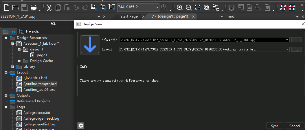Design Sync命令用来同步,执行该命令弹出同步的对话框,schematic处用来设置原理图的文件和保存的路径,该部分的路径是在当前的情况下自动读取。Layout用来设置PCB文件和保存的路径,该部分的路径是在当前的情况下自动读取。