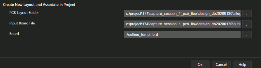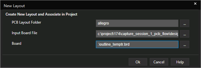 在弹出的新建PCB Layout的设置窗口中,进行参数的设置。PCB Layout Folder用来设置存放allegro网络表的路径,input Board File用来设置输入的PCB Layou文件,这个路径的设置适用于已经存在有PCB文件后的更新操作。(若之前没有PCB文件,这个地方可以空着。)