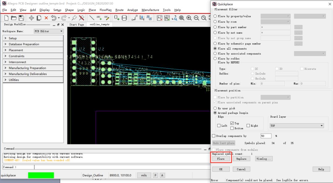 在菜单里面选择Place—Quickplace命令,弹出快速元件摆放的对话框,执行元件摆放的操作。按照电路板的轮廓位置全部摆放下所有的元件。