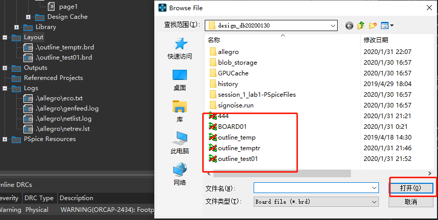 在弹出浏览路径中选中已经存在的.brd文件,文件可以加入到当前的原理图项目管理器中。