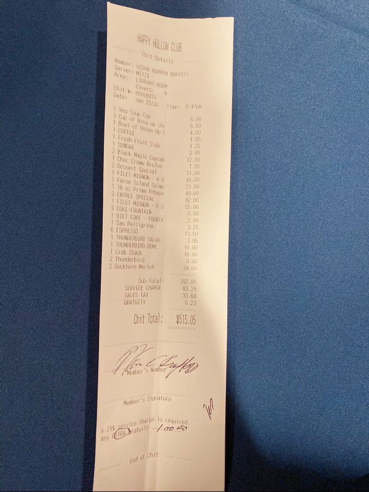 据悉,这顿晚餐持续了3个多小时,主打牛排和可口可乐,孙宇晨也晒出了晚餐账单,共515.05美元,由巴菲特买单。