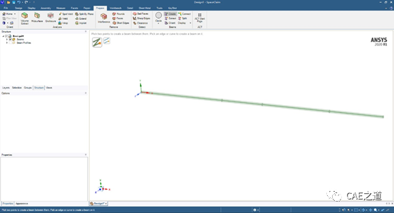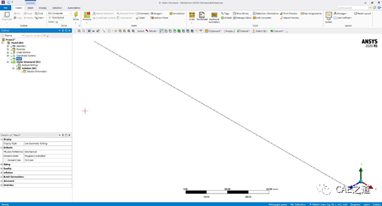 2.网格划分:自由网格划分,网格尺寸设置为10mm。由于建立的是线体模型,WB在网格划分时自动赋予BEAM188单元;