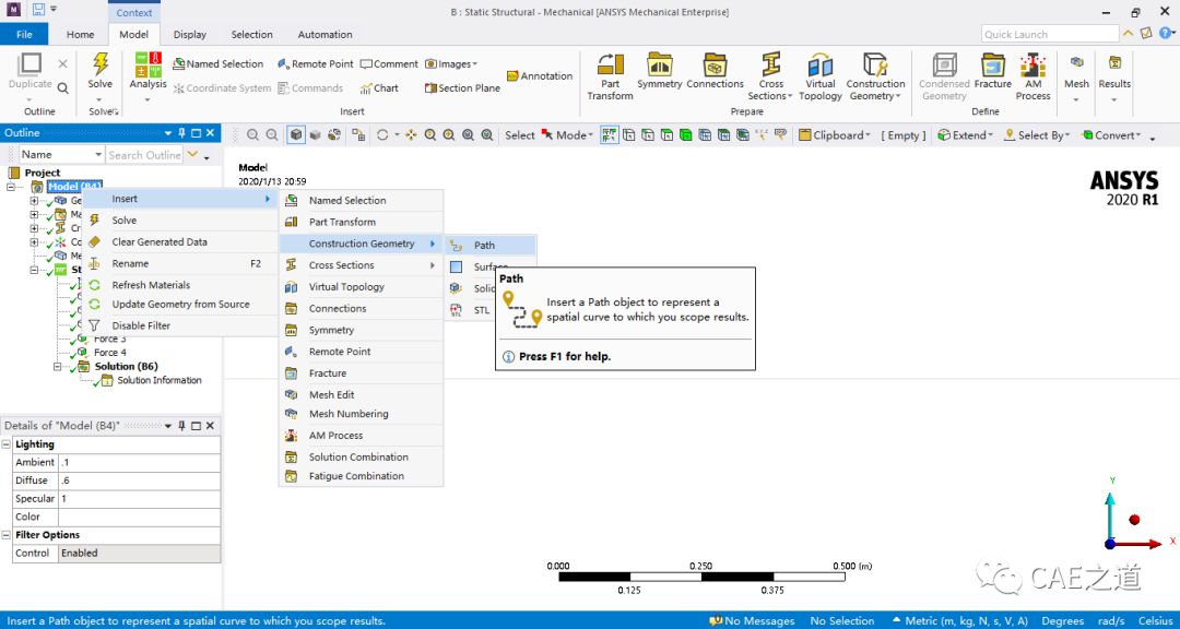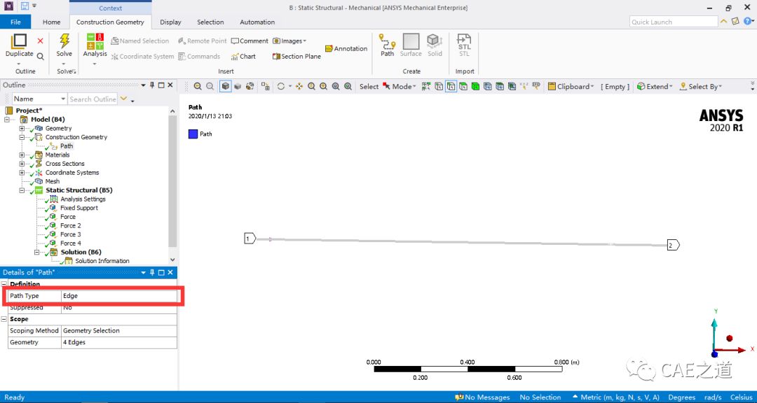 2.建立路径:由于我们需要绘制轴力图,所以我们需要建立一个path,将结果映射到path上;右键Model(B4)→insert→construction geometry→path,然后在Details of path中将path type切换为edge,依次选择建立的四根线体,点击apply确定选择。