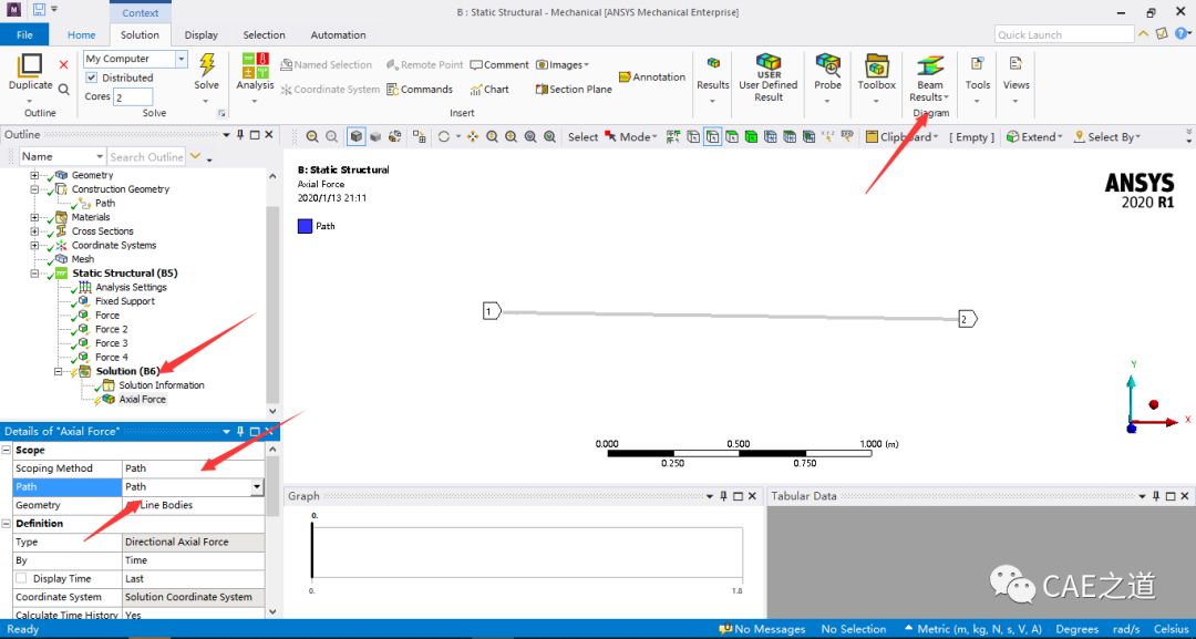 3.提取结果:点击Solution(B6),并选择Beam Results中的Axial Force;在Details of Axial Force中,将Scoping Method改为Path,并在path中选择上一步建立的“path”。最后右击Solution(B6),选择Eevaluate All Results,提取结果。
