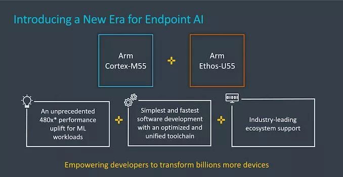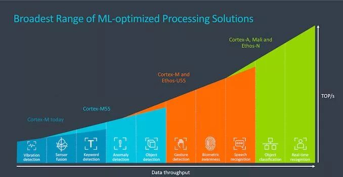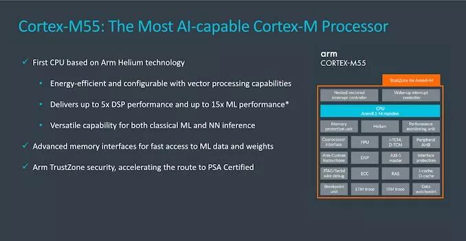 (题图 via AnandTech ) 过去几年,机器学习技术的应用已变得相当普及,可见其在广泛的行业和各种系统中。ARM 认为终端 AI 市场会在未来几年中迎来爆炸性增长,新 IP 就是为此做准备。 首先介绍下 Cortex-M55,它是与 M33 联系更加紧密的新一代 IP,引入了体系架构上的新改进,能够在机器学习和矢量指令方面实现较大的性能和灵活性改进。