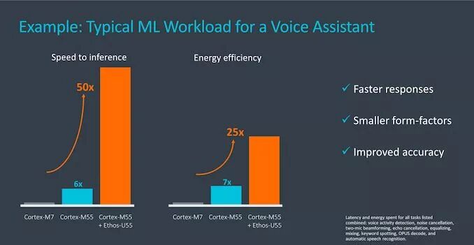 就面积大小而言,U55 最小的 32 MAC 实现,约为 M55 的 2 倍。这里没有绝对的数字提供,实际上讨论的是平方毫米的分数。 与上一代解决方案相比,使用 M55 和 U55 的此类系统,其性能改进意味着相当重要的步进功能提升。与基于 Cortex-M7 的系统相比,ARM 带来了包含 50 倍的性能提升、以及 25X 的能效改进。 至于新 IP 的可用领域,ARM 展望了各式各样的嵌入式系统(主要是现有的芯片子系统)。比如在移动设备上,厂商可在 手机 的指纹传感器、语音助理(实时监听指令)、甚至在 RF 系统中(如天线调谐)使用它来优化工作负载。 当今的移动设备中,有数百种 M 系列 CPU 可从机器学习功能中获益,且其中大多数功能对用户来说是完全透明的。 目前 ARM 已向主要合作伙伴开放 M55 和 U55 的授权,并将在未来几个月内向更广泛的客户群开放,预计最终产品可在厂商二次开发的两年后走向市场。
