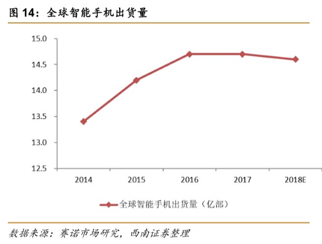 2017年全球智能机出货量达14.7亿部,市场趋于饱和,2018年全球智能机出货量依旧不容乐观。2017年全球智能手机出货的14.7亿部中,其中有4.5亿部来自ODM厂商,占全球手机出货31%。预计2018年ODM自供比例将加大,吸引更多品牌进入,集中度进一步提升,占据极高市场份额的手机ODM行业,并未遭遇成长瓶颈。