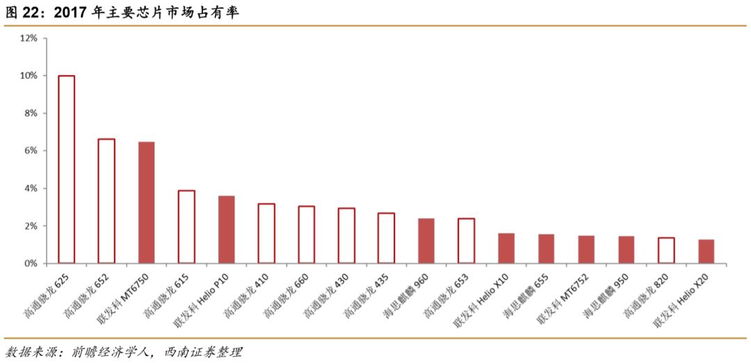 高通在2007年度一季度首次一举成为全球最大的无线半导体供应商,并在此后继续保持这一领导地位。其骁龙移动智能处理器是业界领先的全合一、全系列移动处理器,具有高性能、低功耗、逼真的多媒体和全面的连接性。目前公司的产品和业务正在变革医疗、汽车、物联网、智能家居、智慧城市等多个领域。长期以来,高通芯片垄断了高端手机市场,2017年年度一百款手机处理器各大厂商的当家芯片的市场份额中,高通依然是手机市场名副其实的霸主。