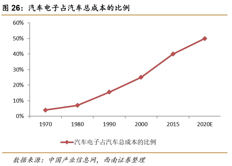 2017年,我国民用汽车拥有量同比增长11.85%。汽车高增长积累起来的庞大基数成为汽车电子市场发展的动力。消费者对车载通讯、娱乐系统的需求提高也会持续拉动汽车电子行业的高增长。随着汽车电子技术的推广,许多汽车电子技术向中低端车普及,用户对于性能和安全的需求也在推动这种趋势。汽车电子部件在整车中的占比不断提升,部分汽车电子部件从提供附加功能向提供基础功能转变,汽车制造商对汽车电子的需求不断增大,到2020年汽车电子在汽车中的成本将达到50%。