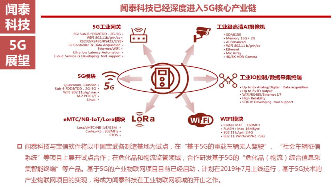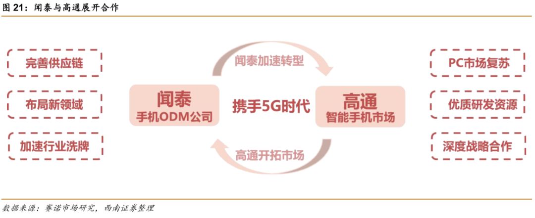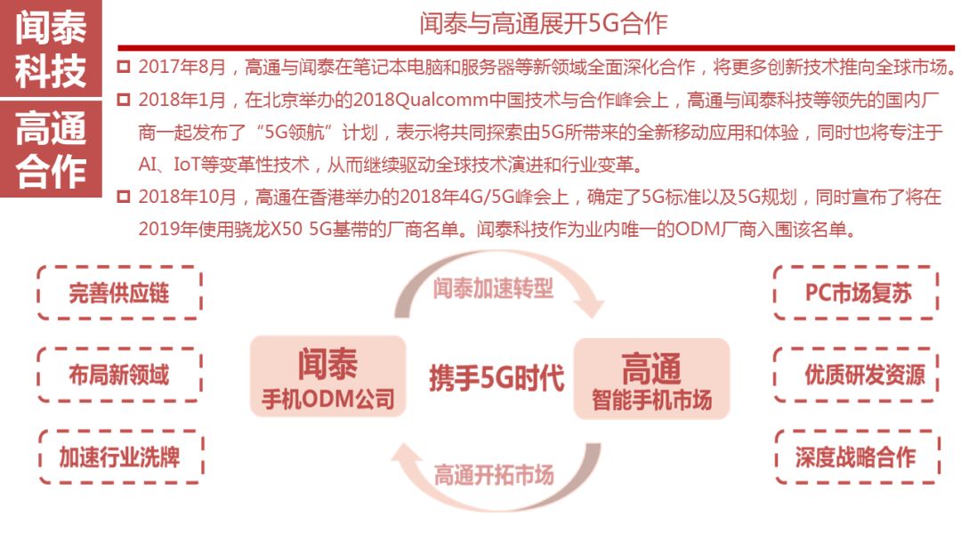2016年10月,闻泰与芯片行业霸主美国高通公司签署战略合作协议,双方拟在未来的新兴领域建立长期紧密的战略合作关系,共同在车载电子、VR技术以及3D智能摄像等领域进行技术和产品开发。2017年3月,高通公司最新一代的旗舰产品骁龙835平台在国内发布,闻泰和小米等少数公司成为高通第一批开发骁龙835平台产品的客户。2017年8月,高通与闻泰在笔记本电脑和服务器等新领域全面深化合作,将更多创新技术推向全球市场。2018年1月,在北京举办的2018Qualcomm中国技术与合作峰会上,高通与闻泰科技等领先的国内厂商一起发布了"5G领航"计划,表示将共同探索由5G所带来的全新移动应用和体验,同时也将专注于AI、IoT等变革性技术,从而继续驱动全球技术演进和行业变革。2018年10月,高通在香港举办的2018年4G/5G峰会上,确定了5G标准以及5G规划,同时宣布了将在2019年使用骁龙X50 5G基带的厂商名单。闻泰科技作为业内唯一的ODM厂商入围该名单。