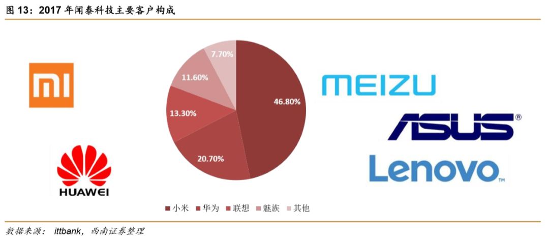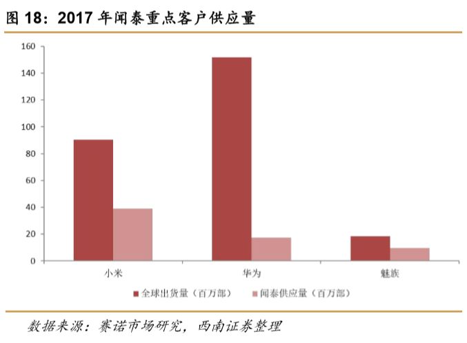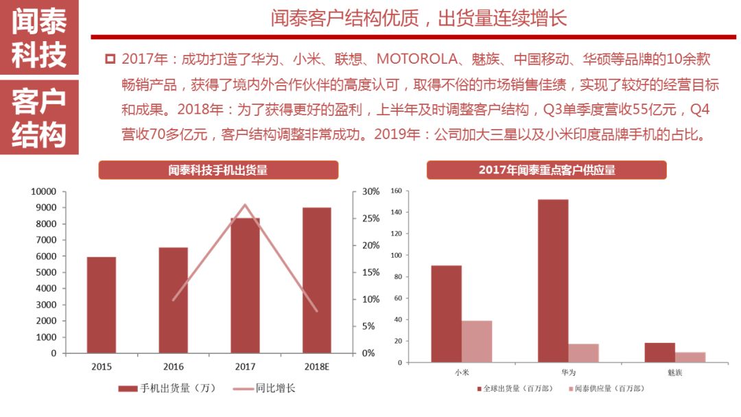 2017年,闻泰的客户占比相应提升;前三大客户占比达81%。公司2017年成功打造了华为、小米、联想、MOTOROLA、魅族、中国移动、华硕等品牌的10余款畅销产品,获得了境内外合作伙伴的高度认可,取得不俗的市场销售佳绩,实现了较好的经营目标和成果。2018年继续施行精品化战略,集中资源研发畅销产品,研发并制造更受消费者广泛青睐的升级产品,扩大合作伙伴和公司自身的市场占有份额,实现客户、供应商、公司和行业的全方位共赢共享。