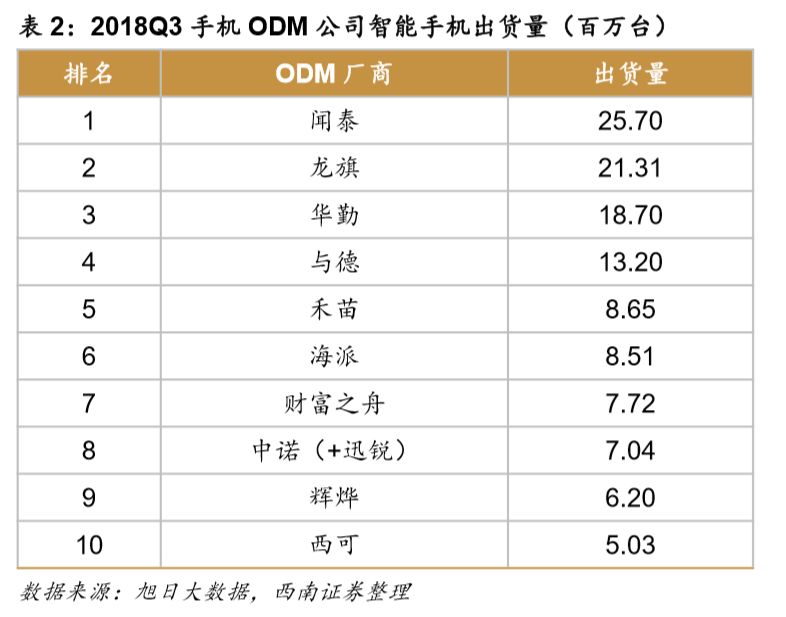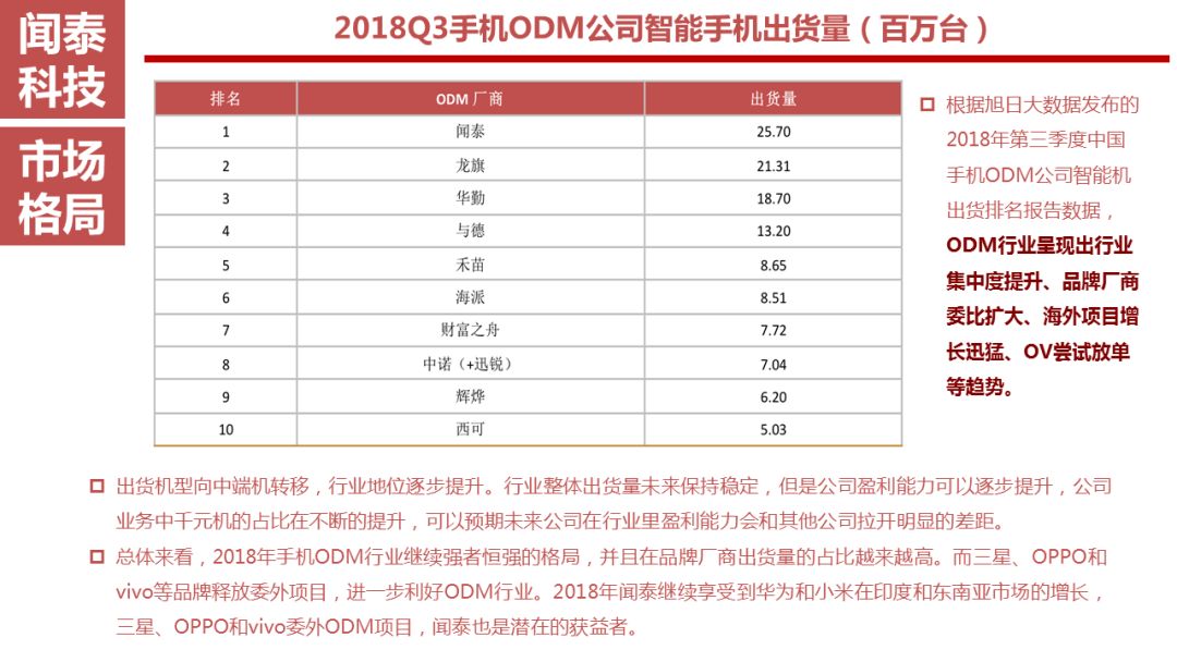 根据旭日大数据发布的2018年第三季度中国手机ODM公司智能机出货排名报告数据,ODM行业呈现出行业集中度提升、品牌厂商委比扩大、海外项目增长迅猛、OV尝试放单等趋势。