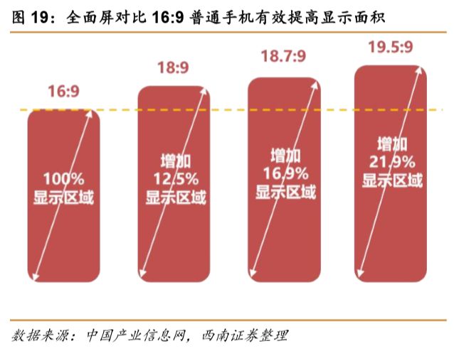 受手掌大小限制,消费者难以单手操控整机尺寸过大的手机,因此手机屏幕不可能无限增长。提高屏占比,打造全面屏手机成为满足消费需求的重要途径。全面屏手机是屏占比达80%以上,手机屏幕比例接近18:9的手机。由于目前的技术水平限制,手机前置的一些传感器还没有合适的隐藏方案,所以屏占比达80%以上一般就被认为是全面屏手机。同时,传统智能手机采用的显示屏分辨率比例均为16:9,而目前全面屏手机的屏幕比例接近18:9。18:9的全面屏方案相比于传统的16:9显示方案,同样大小的手机中其屏幕的尺寸会提升约10%左右,而异形屏的全面屏手机提升更大,因此全面屏可以在不加大握持难度的情况下提高屏幕尺寸。