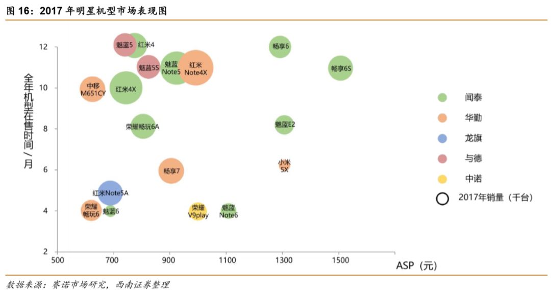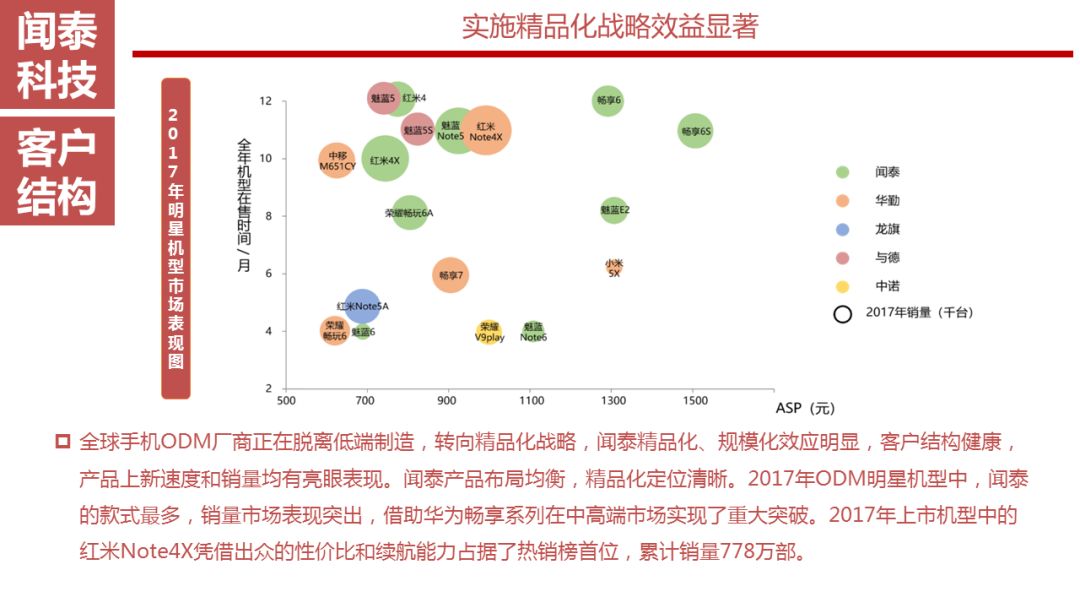 全球手机ODM厂商正在脱离低端制造,转向精品化战略,闻泰精品化、规模化效应明显,客户结构健康,产品上新速度和销量均有亮眼表现。闻泰产品布局均衡,精品化定位清晰。2017年ODM明星机型中,闻泰的款式最多,销量市场表现突出,借助华为畅享系列在中高端市场实现了重大突破。2017年上市机型中的红米Note4X凭借出众的性价比和续航能力占据了热销榜首位,累计销量778万部。
