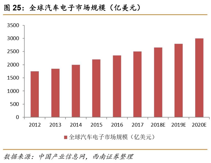 2017年全球汽车电子市场规模接近2300亿美元,预计到2020年将达到3000亿美元。随着全球汽车产业转移的不断深化,明显的成本优势和广阔的本土市场使得以中国为代表的新兴国家和地区的汽车产量在全球占比不断提高,而以欧美为代表的传统汽车市场则面临着缩小的趋势。2009年,我国汽车产销分别完成1379.10万辆和1364.48万辆,首次超过美国成为汽车产销第一大国,从此开始我国汽车的产销量连续居世界第一。