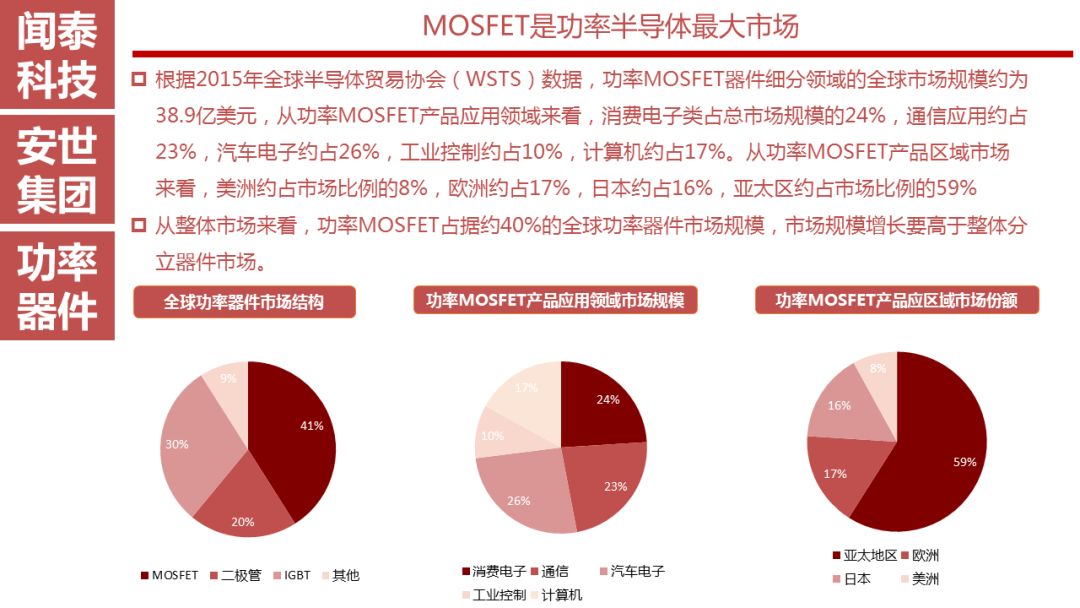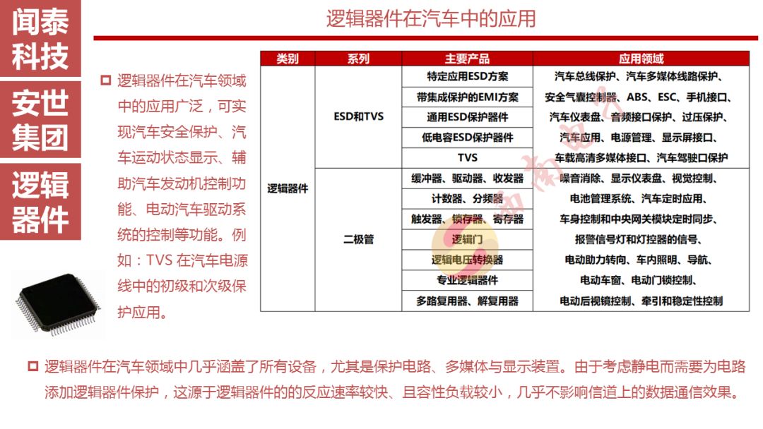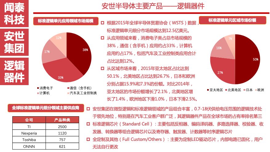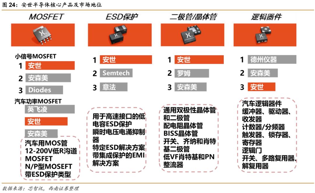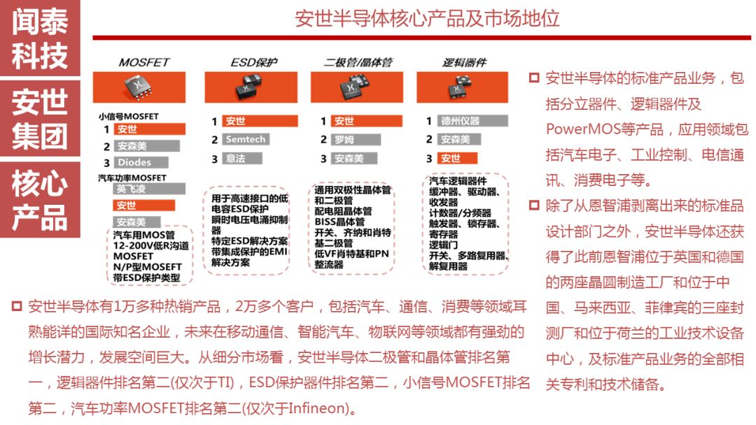 安世半导体有1万多种热销产品,2万多个客户,包括汽车、通信、消费等领域耳熟能详的国际知名企业,未来在移动通信、智能汽车、物联网等领域都有强劲的增长潜力,发展空间巨大。从细分市场看,安世半导体二极管和晶体管排名第一,逻辑器件排名第二(仅次于TI),ESD保护器件排名第二,小信号MOSFET排名第二,汽车功率MOSFET排名第二(仅次于Infineon)。