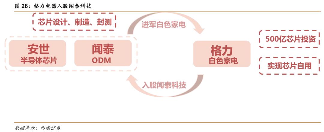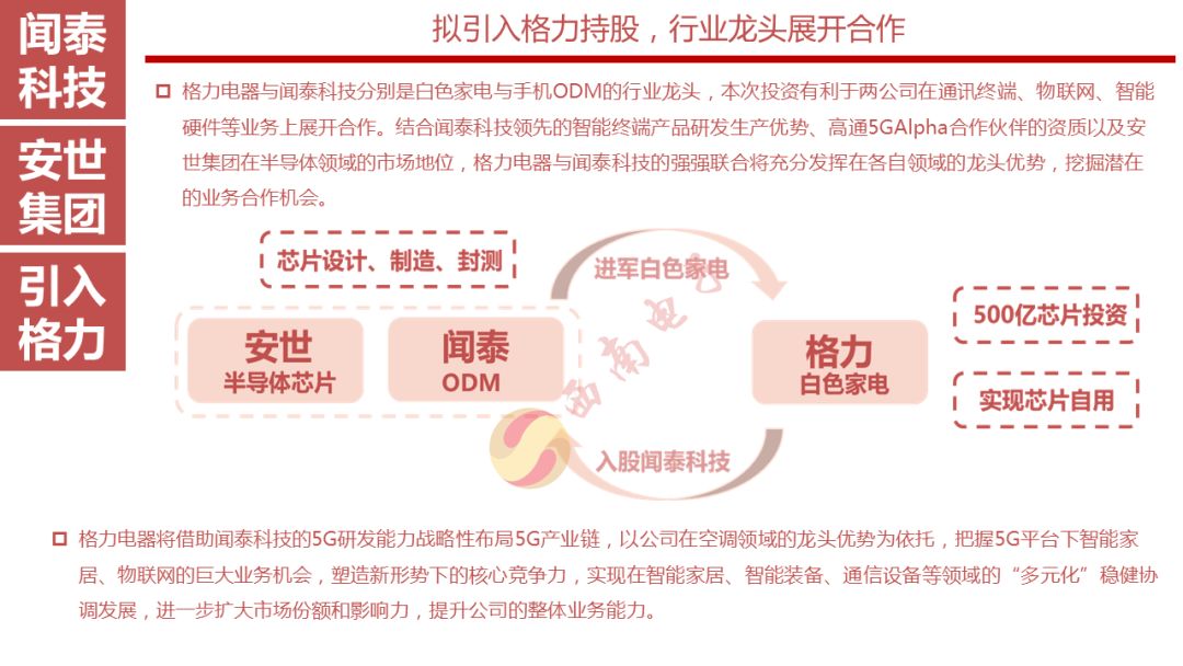 格力电器与闻泰科技分别是白色家电与手机ODM的行业龙头,本次投资有利于两公司在通讯终端、物联网、智能硬件等业务上展开合作。结合闻泰科技领先的智能终端产品研发生产优势、高通5GAlpha合作伙伴的资质以及安世集团在半导体领域的市场地位,格力电器与闻泰科技的强强联合将充分发挥在各自领域的龙头优势,挖掘潜在的业务合作机会。
