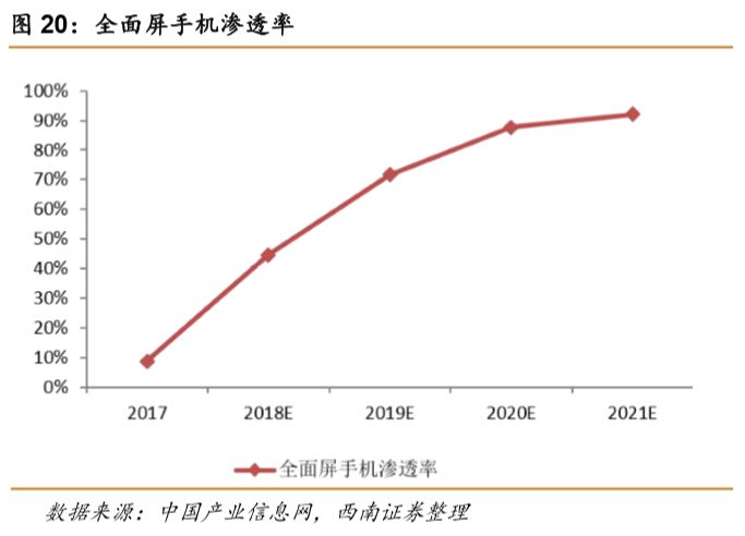 全面屏手机的超窄边框设计给消费者带来强烈的视觉冲击,因此能够在外观上给消费者留下深刻的第一印象。全面屏更有利于分屏多任务显示等功能的实现,能够显著提升操作体验。2017年,三星、iPhone等手机品牌都打上了“全面屏”的标签。全面屏这一新兴手机概念的提出使其在手机市场的渗透率迅速提升,2017年全面屏在智能机市场的渗透率只有6%,2018年会飙升至50%,后续逐步上升至2021年的93%。