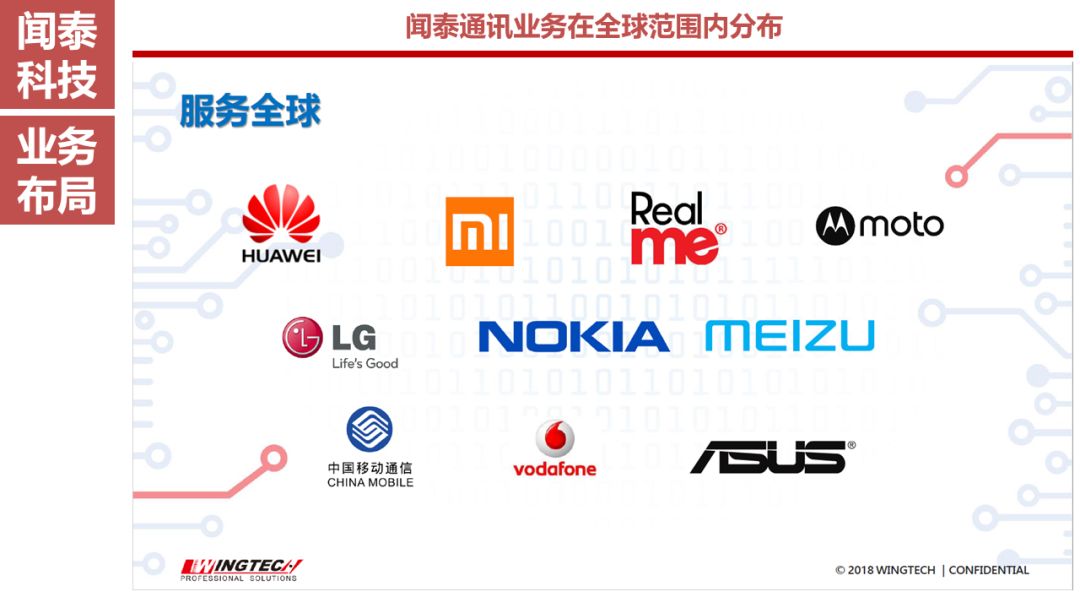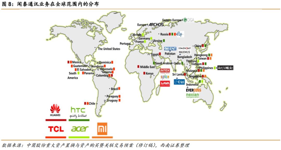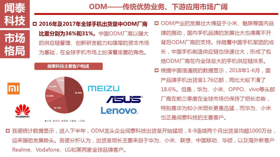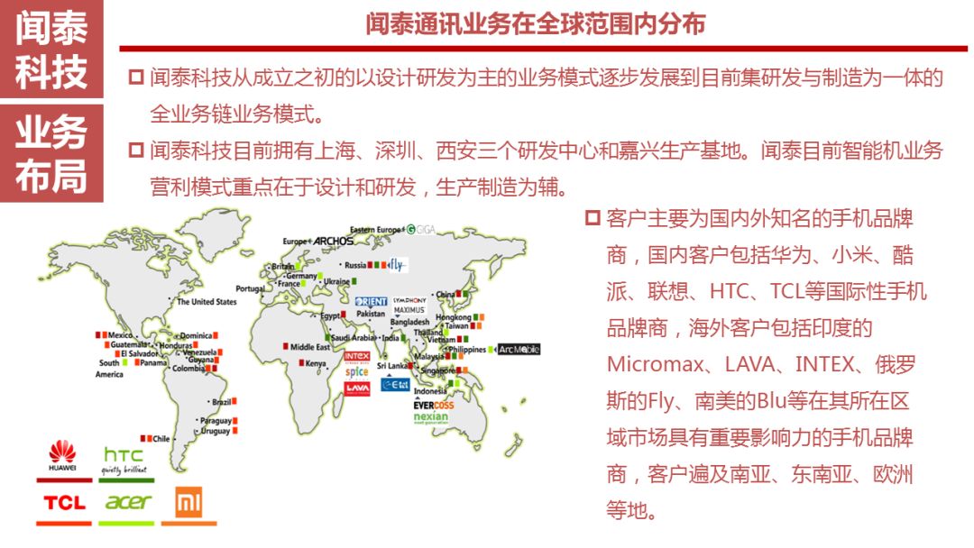 闻泰科技从成立之初的以设计研发为主的业务模式逐步发展到目前集研发与制造为一体的全业务链业务模式。闻泰科技从智能通讯主板、无线通讯模块到硬件生产与组装和软件开发,积累了丰富的设计研发经验,凭借强大的研发设计能力和制造能力获得了客户的认可,也逐步树立了在行业中的地位。客户主要为国内外知名的手机品牌商,国内客户包括华为、小米、酷派、联想、HTC、TCL等国际性手机品牌商,海外客户包括印度的Micromax、LAVA、INTEX、俄罗斯的Fly、南美的Blu等在其所在区域市场具有重要影响力的手机品牌商,客户遍及南亚、东南亚、欧洲等地。