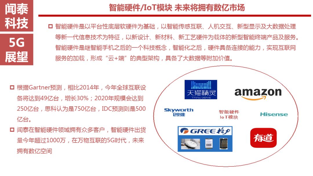 闻泰科技致力于扩展业务的上下游,打造生态链企业。收购上游的安世半导体,进军汽车电子领域,与高通合作,全面布局5G领域。目前闻泰已经实现以手机为核心,向5G、AR/VR、车联网、智能家居、人工智能(AI)等智能硬件领域扩张的产业格局,闻泰科技将抓住智能硬件未来十年的黄金发展期,形成千亿产值智能硬件生态链公司。
