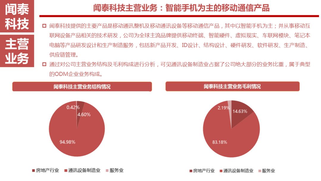 闻泰科技提供的主要产品是移动通讯整机及移动通讯设备等移动通信产品,其中以智能手机为主,并从事移动互联网设备产品相关的技术研发,公司为全球主流品牌提供移动终端、智能硬件、虚拟现实、车联网模块、笔记本电脑等产品研发设计和生产制造服务,包括新产品开发、ID设计、结构设计、硬件研发、软件研发、生产制造、供应链管理。此外还有部分房地产业务,属于资产重组前中茵股份主营业务,公司2017年已经公告剥离剩余房地产业务,2018年将继续深化和推进公司发展战略,积极推进相关资产的交割,完全实现去地产化,彻底实现公司业务转型。