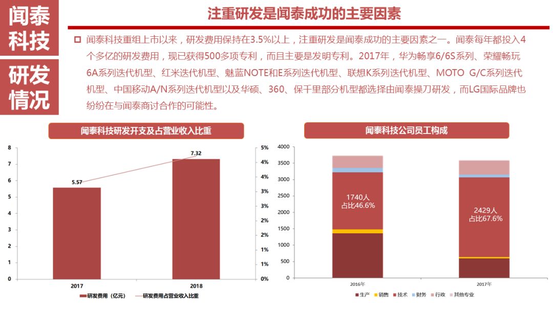闻泰科技重组上市以来,研发费用保持在3.5%以上,注重研发是闻泰成功的主要因素之一。闻泰每年都投入4个多亿的研发费用,现已获得500多项专利,而且主要是发明专利。2017年,华为畅享6/6S系列、荣耀畅玩6A系列迭代机型、红米迭代机型、魅蓝NOTE和E系列迭代机型、联想K系列迭代机型、MOTO G/C系列迭代机型、中国移动A/N系列迭代机型以及华硕、360、保千里部分机型都选择由闻泰操刀研发,而LG国际品牌也纷纷在与闻泰商讨合作的可能性。
