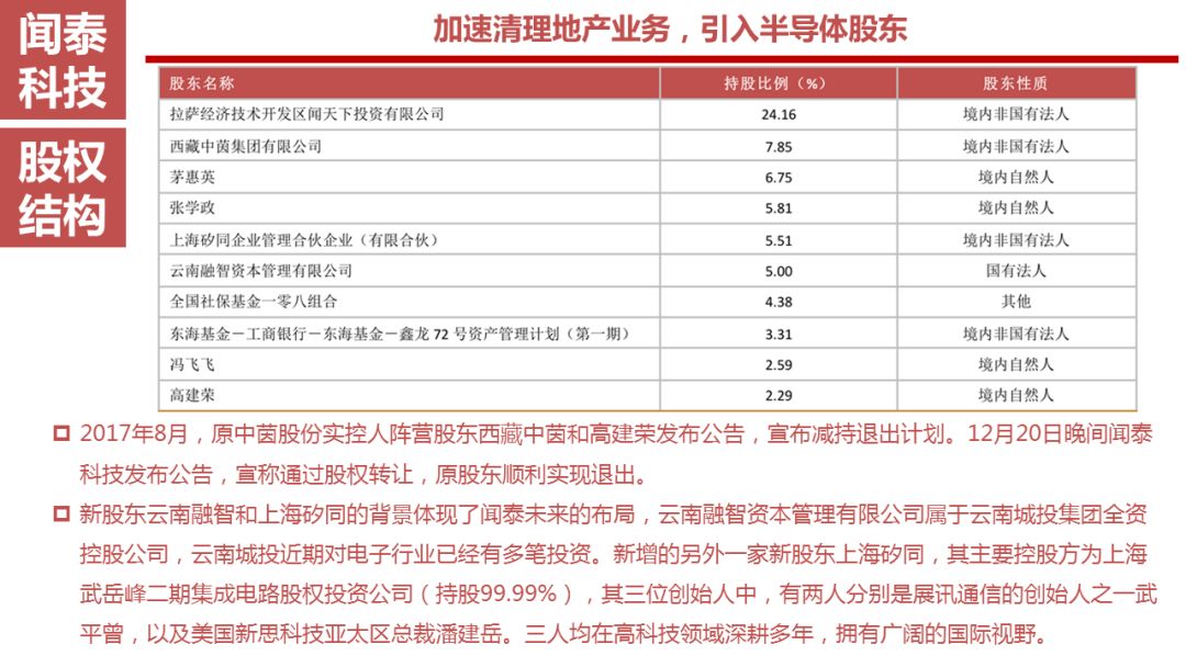 2017年8月,原中茵股份实控人阵营股东西藏中茵和高建荣发布公告,宣布减持退出计划。12月20日晚间闻泰科技发布公告,宣称通过股权转让,原股东顺利实现退出。此次股权转让完成之后,云南融智持有闻泰科技8186万股,占公司股份总数的12.85%,上海矽同持有公司3510万股,占公司股份总数的5.51%,而中茵方剩余1458万股(合计持股比例由15.65%降至2.29%),基本实现退出。