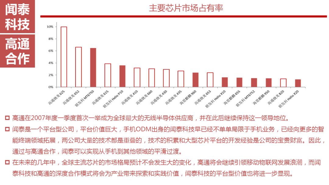在未来的几年中,全球主流芯片的市场格局预计不会发生大的变化,高通将会继续引领移动物联网发展浪潮,而闻泰科技和高通的深度合作模式将会为产业带来探索和实践价值,闻泰科技的平台型价值也将进一步显现。
