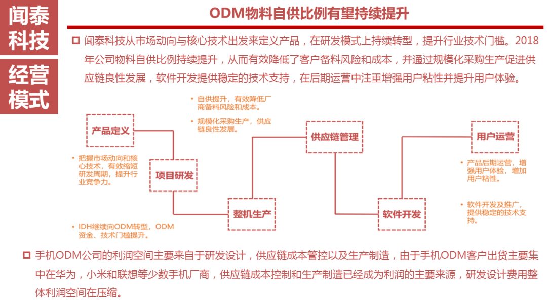 闻泰科技从市场动向与核心技术出发来定义产品,在研发模式上持续转型,提升行业技术门槛。2018年公司物料自供比例持续提升,从而有效降低了客户备料风险和成本,并通过规模化采购生产促进供应链良性发展,软件开发提供稳定的技术支持,在后期运营中注重增强用户粘性并提升用户体验。