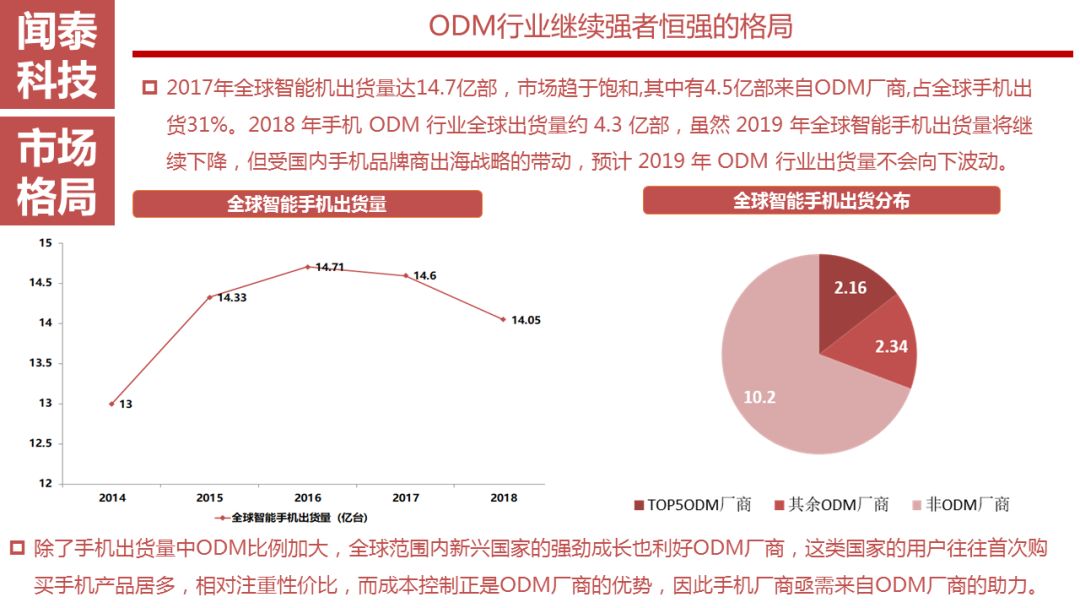 总体来看,2018年手机ODM行业继续强者恒强的格局,并且在品牌厂商出货量的占比越来越高。而三星、OPPO和vivo等品牌释放委外项目,进一步利好ODM行业。2018年闻泰继续享受到华为和小米在印度和东南亚市场的增长,三星、OPPO和vivo委外ODM项目,闻泰也是潜在的获益者。