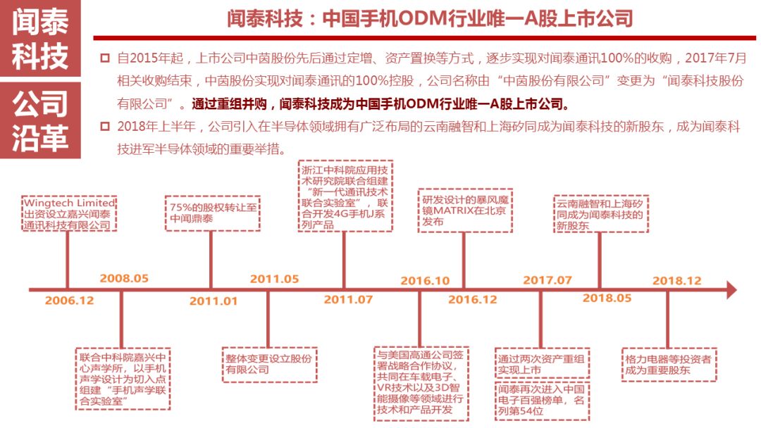 自2015年起,上市公司中茵股份先后通过定增、置产置换等方式,逐步实现对闻泰通讯100%的收购,2017年7月相关收购结束,中茵股份实现对闻泰通讯的100%控股,公司名称由“中茵股份有限公司”变更为“闻泰科技股份有限公司”。随后,闻泰通讯创始人张学政通过增持股份成为了中茵集团的实际控制人,并担任上市公司董事长、总裁职务。通过重组并购,闻泰科技成为中国ODM行业唯一A股上市公司。2018年上半年,公司引入在半导体领域拥有广泛布局的云南融智和上海矽同成为闻泰科技的新股东,成为闻泰科技进军半导体领域的重要举措。