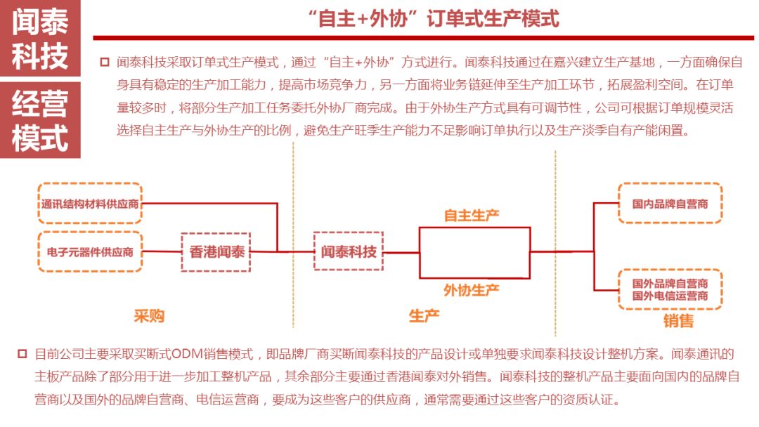 目前公司主要采取买断式ODM销售模式,即品牌厂商买断闻泰科技的产品设计或单独要求闻泰科技设计整机方案。闻泰通讯的主板产品除了部分用于进一步加工整机产品,其余部分主要通过香港闻泰对外销售。闻泰科技的整机产品主要面向国内的品牌自营商以及国外的品牌自营商、电信运营商,要成为这些客户的供应商,通常需要通过这些客户的资质认证。