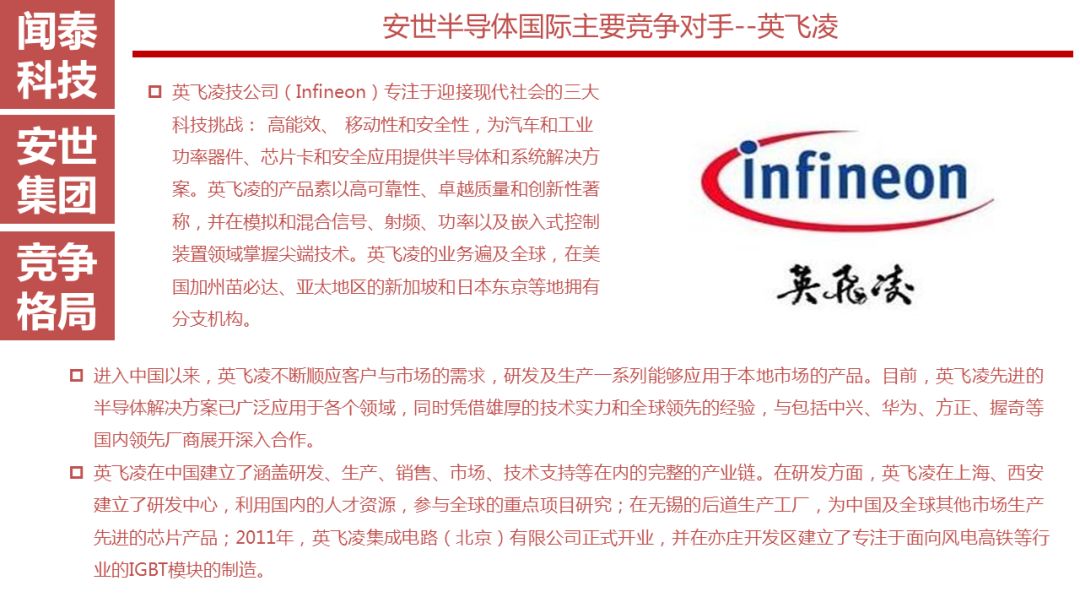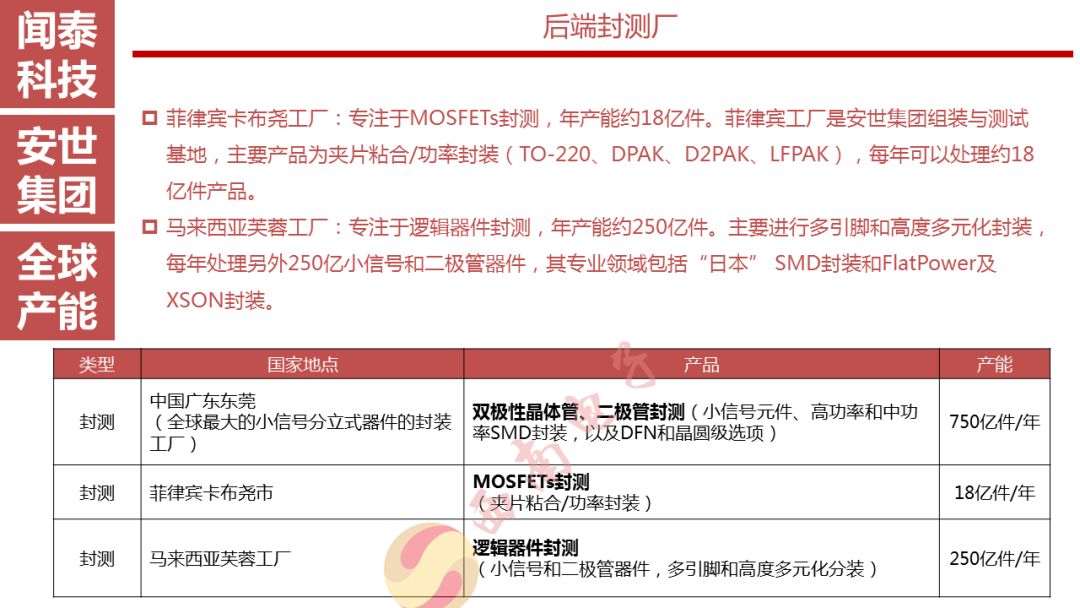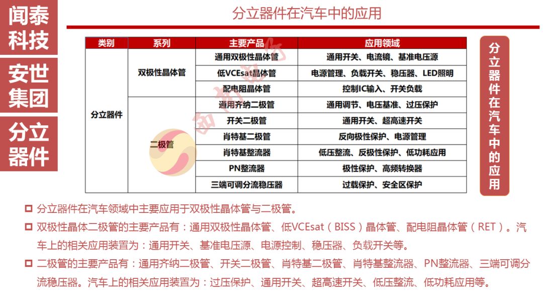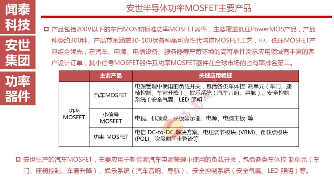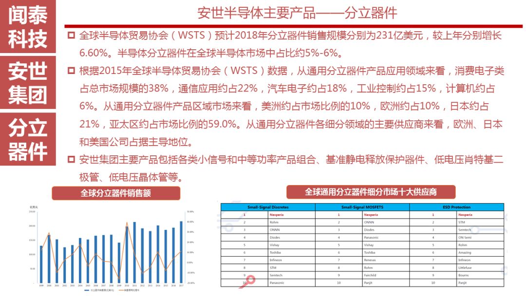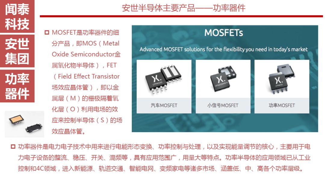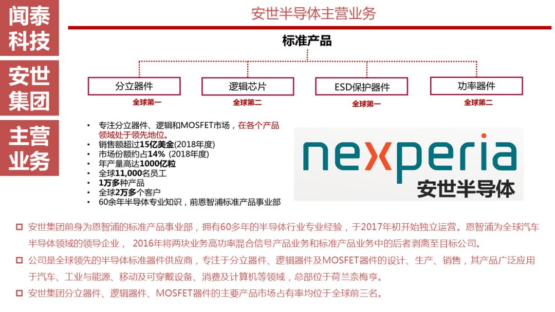安世半导体是分立器件、逻辑器件及MOSFET器件的领导者,其前身为恩智浦的标准产业业务部门,2016年恩智浦将其剥离并转让给建广资产以及智路资本,2016年12月建广资产与智路资本合资成立的裕成控股成立安世集团,安世集团于2017年2月7日以现金27.6亿美元收购了恩智浦所持有的安世半导体100%股权。