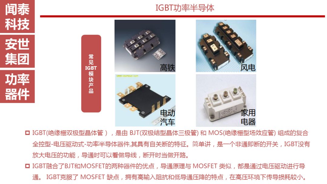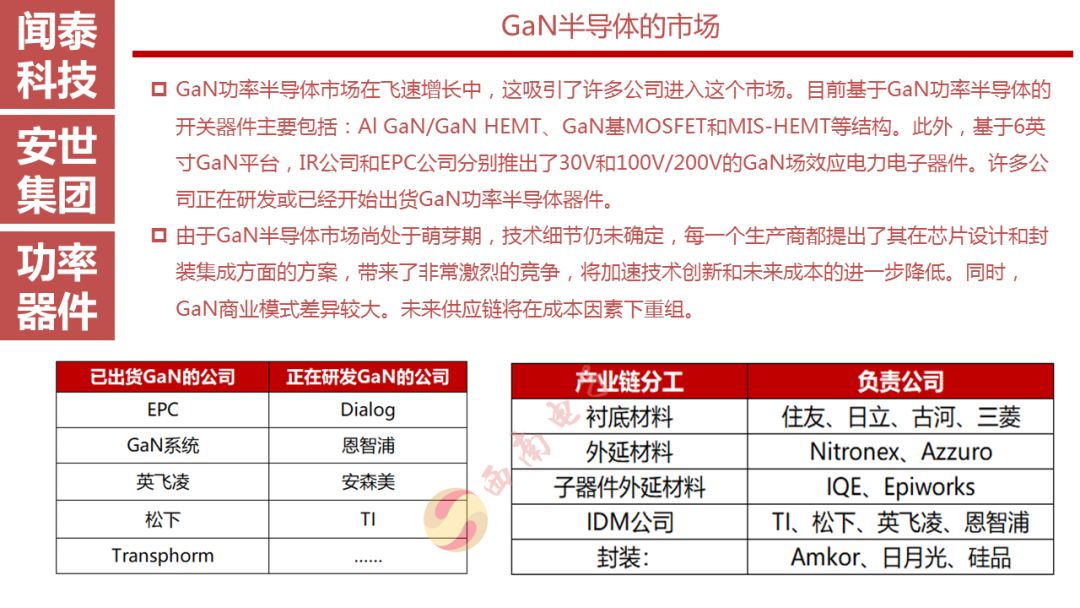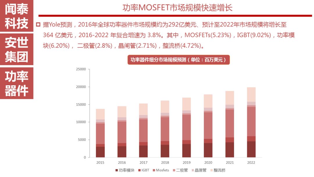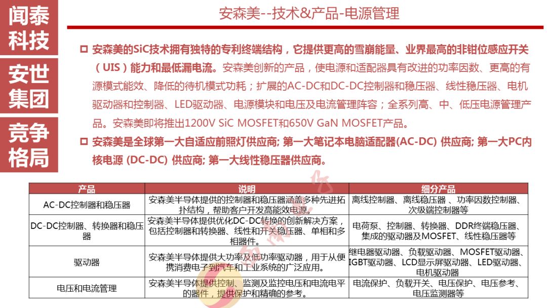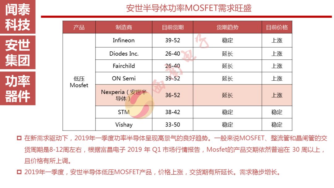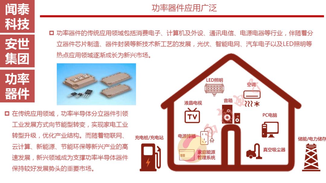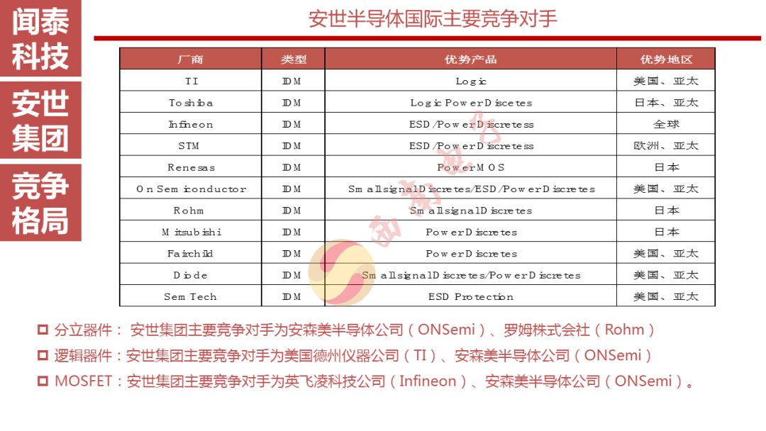 安世半导体是分立器件、逻辑器件及MOSFET器件的领导者,其前身为恩智浦的标准产业业务部门,2016年恩智浦将其剥离并转让给建广资产以及智路资本,2016年12月建广资产与智路资本合资成立的裕成控股成立安世集团,安世集团于2017年2月7日以现金27.6亿美元收购了恩智浦所持有的安世半导体100%股权。