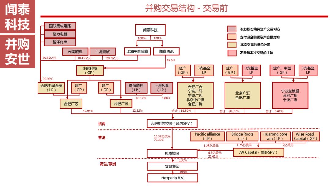 闻泰科技于2018年10月25日发布预案,拟通过发行股份及支付现金的方式,收购安世集团部分GP和LP份额,以实现对目标公司安世集团的间接控制。安世集团持有安世半导体100%的股份。此次闻泰科技控股安世半导体并不是简单的财务投资,而是要大举进军半导体产业。在此之前,闻泰科技控股母公司拉萨闻天下投资有限公司虽然曾参与了全球知名图像传感器公司美国豪威科技(OmniVision)私有化,为单一最大股东,并且也曾欲与韦尔半导体竞争豪威科技,但随后韦尔半导体的控制人虞仁荣进入豪威半导体董事会并担任CEO,最终闻泰张学政果断放弃,卖掉了所持有豪威科技股份。