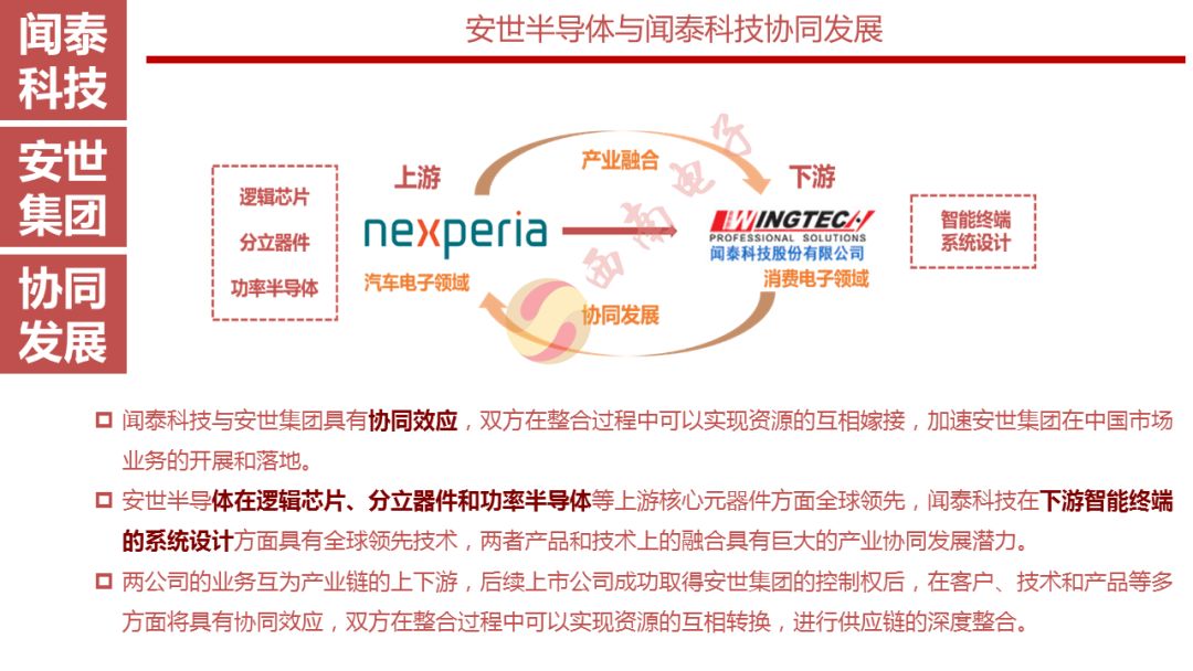 对安世集团而言,闻泰科技除了可为其半导体元器件提供出货量的保障,也可以助力其扩大和提升其在中国市场的影响力和竞争力,开拓渠道,扩展用户范围,进一步拓展其在消费电子领域的市场。对闻泰科技而言,有了上游的安世集团提供长期稳定的元器件供货保障,可增强其议价能力和风险抵御能力。双方将努力通过业务整合实现优势互补、协同共赢。