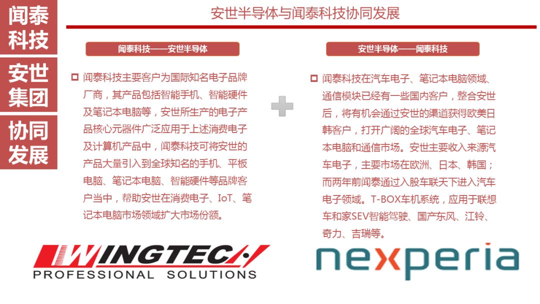 闻泰在消费品领域,特别是手机领域行业领先,未来也会走向汽车电子和IoT,利用5G平台全面进入汽车电子和IoT。闻泰科技通过取得安世集团的控制权,可以实现向高附加值的产业链上游的布局,将有利于其现有业务的横向拓展,包括智能手机、车联网、汽车电子、笔记本电脑等。