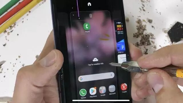 另外,在测试视频末尾,Zack Nelson又开始用工具对Galaxy Z Flip的屏幕进行穿刺测试,测试结果显示仅是OLED面板出现了损坏,表面的玻璃没有出现任何碎裂痕迹,这就意味着Galaxy Z Flip的表层玻璃并不是硬性玻璃。Zack Nelson认为,三星的UTG玻璃可能使用了塑料聚合物,在其中混入了玻璃的细微碎屑,所以它和传统玻璃有很大区别。但是这方面信息,三星却并未在发布会上向大家说明。
